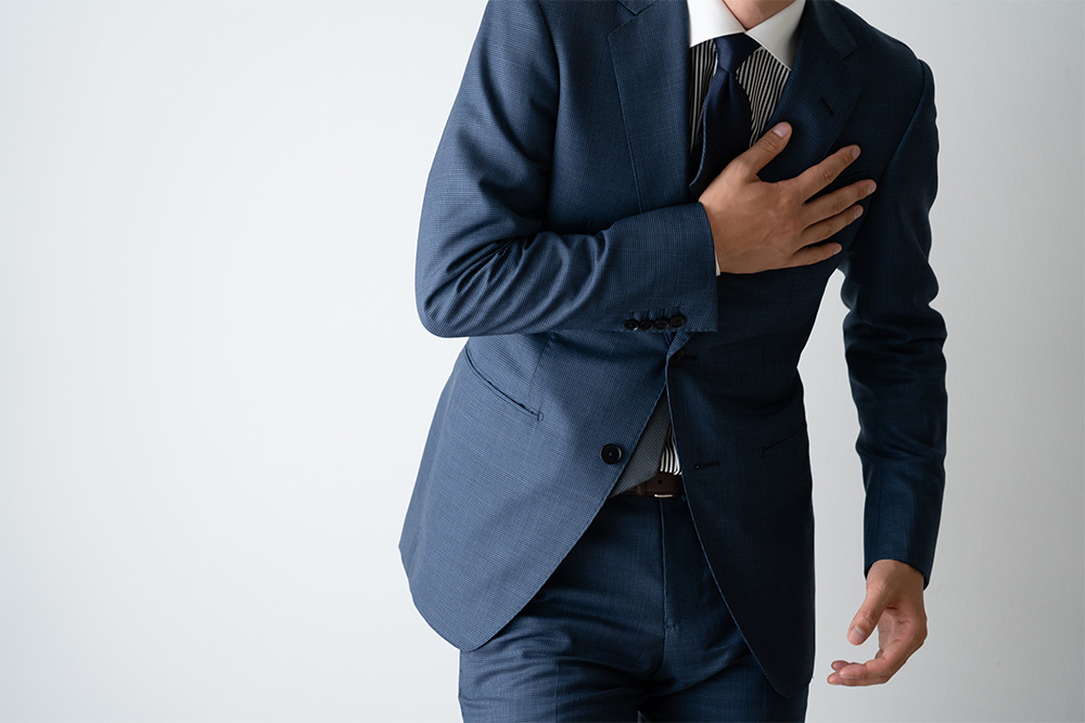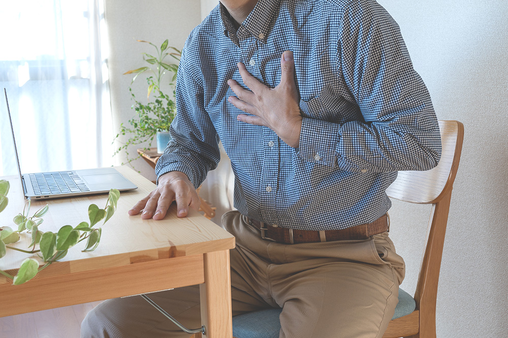 動脈硬化や成人病などが原因で冠動脈の血流が低下すると、心臓が酸素不足に陥り、胸の痛み、圧迫感、絞扼(こうやく)感(しめつけられる感じ)などの胸部症状が現れます。これが狭心症の発作です。最初のうちは、心臓がたくさんの酸素を必要とする運動時だけに症状が出ることが多く(労作性狭心症)、安静にすると治まることが多いのですが、病状が進行すると安静時にも症状が現れるようになります。また、狭心症の中には、冠動脈に動脈硬化がなくても、冠動脈自体が痙攣(れん縮)し血流が悪くなり、狭心症のような症状が出る場合があります。このような状態を「冠れん縮性狭心症」といいます。特に夜間から朝方にかけて胸痛発作が出現し、「朝方に胸が痛くて目が覚めた」という患者さんが多くいらっしゃいます。胸部症状を自覚するときには、早めに検査を受けることが大切です。